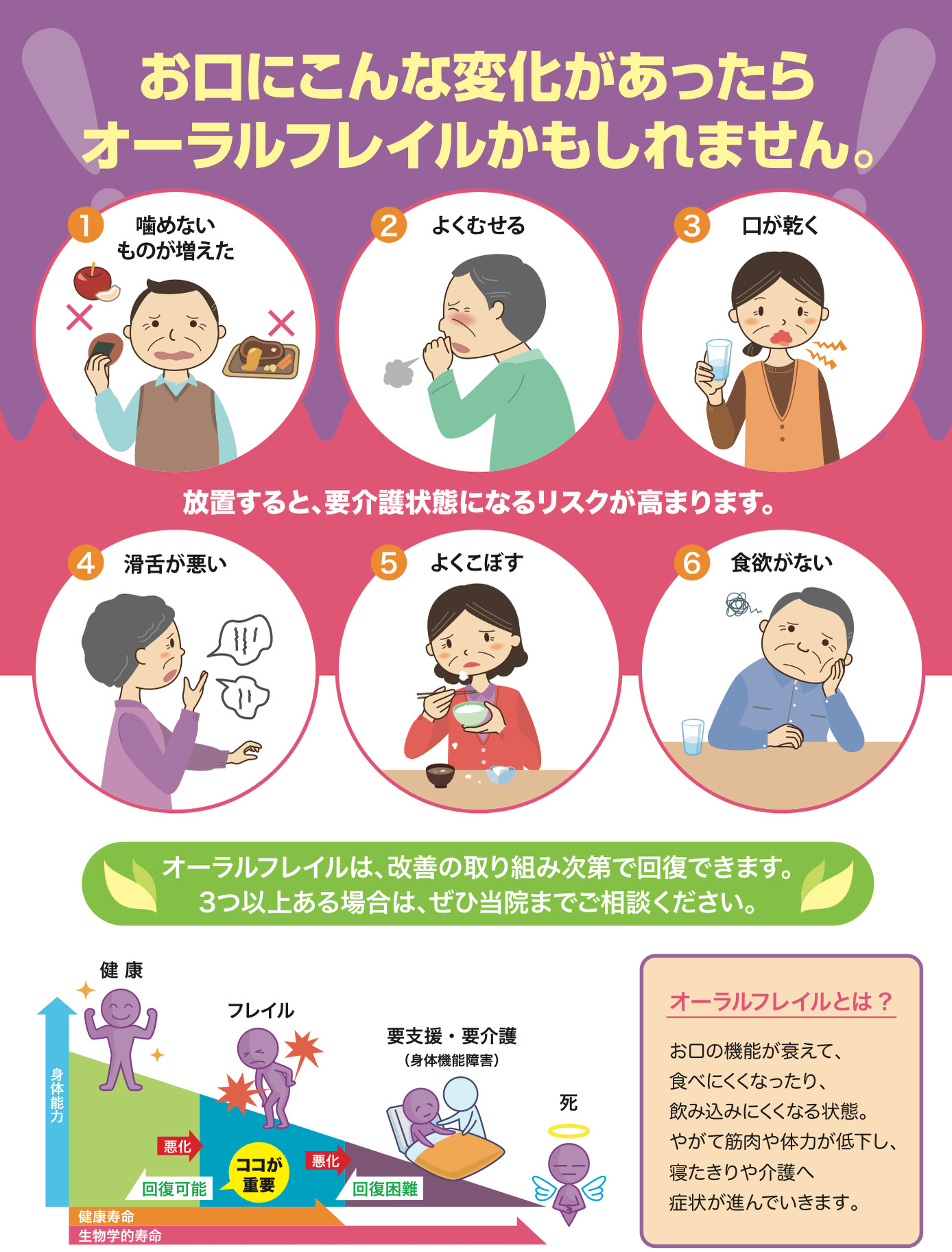 疾患や障害など様々な要因によって,口腔の機能が複合的に低下している疾患。放置しておくと咀嚼障害,摂食嚥下障害など口腔の機能障害を引き起こし,また,低栄養やフレイル、サルコペニアを進展させるなど全身の健康を損なうことです。